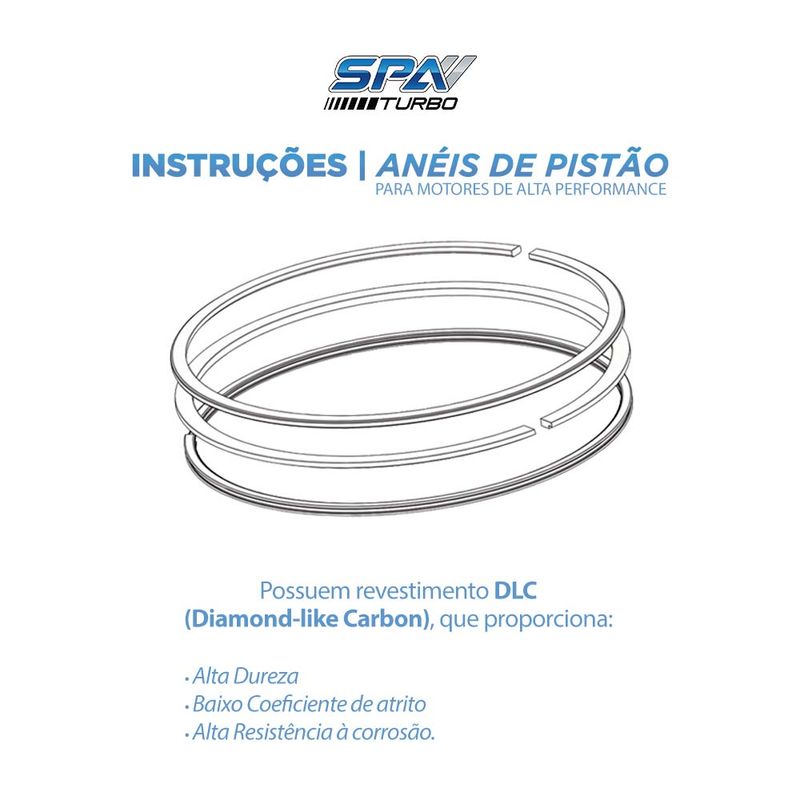1º anel 1,5mm - Fabricado em aço carbono, que é 35% mais resistente que o ferro fundido e em média 30% mais leve. Com tratamento DLC, que é a aplicação de partículas de carbono, cujas propriedades físicas e químicas são muito próximas as do diamante, conferindo maior resistência ao material e reduzindo a fricção da superfície, o que diminui significativamente o atrito quando em trabalho contra outras superfícies.