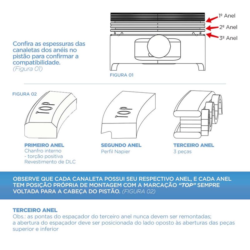 3º anel 2,0mm - Fabricado em 3 peças, o que garante fácil manutenção, melhor estabilidade no controle do filme de óleo e melhora a retirada do óleo pelos furos de lubrificação do pistão, pois tem melhor área para deslocar esse óleo.